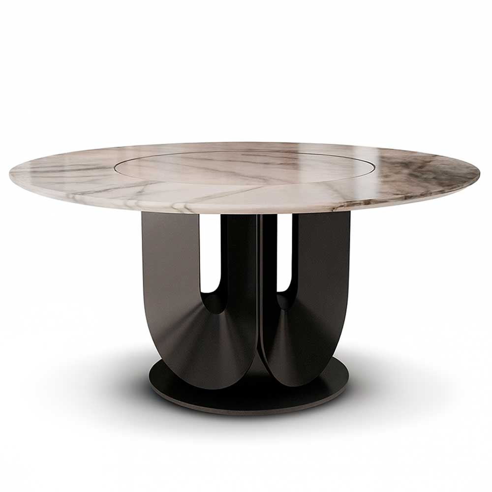 Обеденный стол объединяет эстетику натурального мрамора и выразительный современный дизайн. Круглая столешница из мрамора подчёркивает природный рисунок камня, создавая эффект глубины и лёгкого сияния.