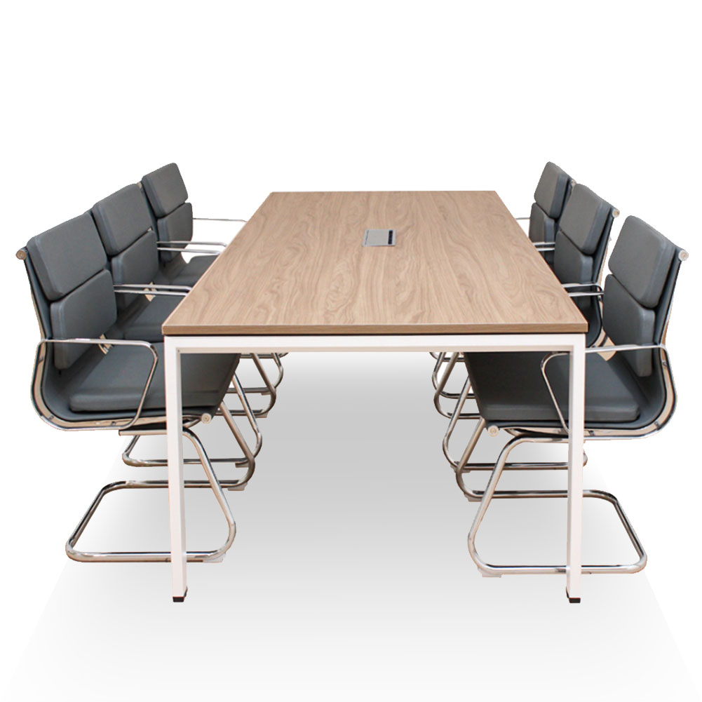Конференц-стол идеально подходит для офисных переговорных и рабочих зон. Столешница из ЛДСП ясень бежевый создаёт лёгкий и элегантный внешний вид, а прочные металлические ножки и каркас светло-серого цвета гарантируют надёжность и долговечность. В интегрированном отсеке удобно размещаются зарядные устройства и провода для подключения ноутбуков, что помогает поддерживать порядок и обеспечивать комфортное использование техники.